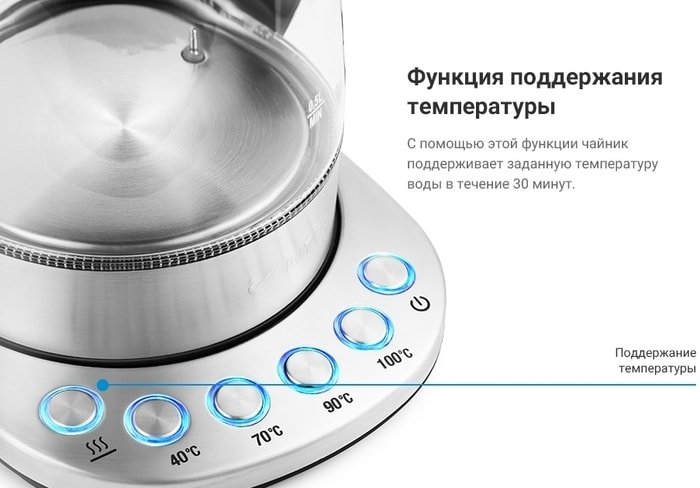 | Информация | Температура воды контролируется встроенным в дно чайника термодатчиком |