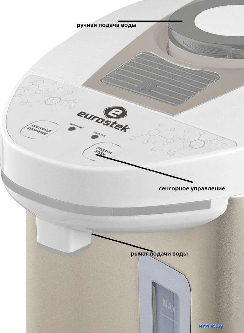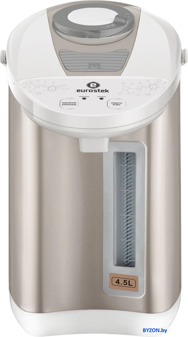 | Информация | Термопот Eurostek ETP-045М подогреет жидкость до необходимой пользователю температуры. Достаточно определиться с подходящим между 2 режимов, используя кнопочную панель. Фильтр займется устранением накипи и других примесей. Начало работы сопровождается включением подсветки. Переноска прибора обеспечивается прочной ручкой. Термопот Eurostek ETP-045М мощностью 900 Вт обладает системой блокировки, которая препятствует обжиганию паром. Удобству при регулярной очистке емкости способствует нагревательный элемент закрытого типа. На пластиковом корпусе бежевого цвета расположена мерная шкала, указывающая остаток содержимого в 4.5-литровом резервуаре. Подача воды производится через кнопку-помпу и электрический насос. |