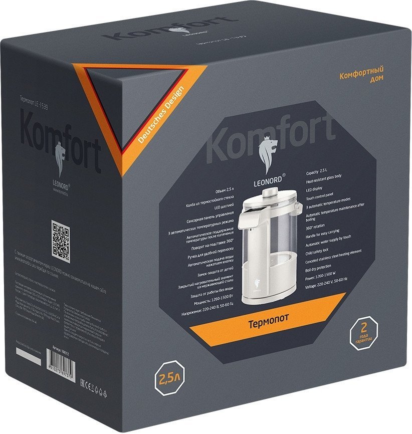 | Информация | ??Текст описания составлен при помощи искусственного интеллекта. - Термопот Leonord LE-1539 — это идеальное решение для тех, кто ценит комфорт и удобство в приготовлении горячих напитков. С его помощью вы сможете легко поддерживать нужную температуру воды в диапазоне от 40 до 95 градусов, что делает его универсальным помощником для чая, кофе и других горячих напитков. - Уникальная функция поддержания температуры позволяет вам наслаждаться горячими напитками в любое время. Больше не нужно беспокоиться о том, что вода остынет — термопот сделает это за вас! - Удобный внешний уровень воды по бокам устройства позволяет быстро и легко контролировать количество жидкости внутри. Вы всегда будете знать, когда пора долить воду. - Подставка с возможностью вращения обеспечивает легкий доступ к термопоту с любой стороны, что особенно удобно, если у вас ограниченное пространство на кухне. - Сетевой шнур длиной 0.78 м дает вам свободу в размещении термопота, а стильный корпус из пластика и стекла гармонично впишется в любой интерьер. - Сенсорное управление делает использование термопота простым и интуитивно понятным. Вы сможете легко настроить нужные параметры всего одним касанием. - Обратите внимание на мощность устройства — 1500 Вт, что обеспечивает быстрый нагрев воды и экономию времени. - Объем в 2.5 литра позволяет готовить достаточное количество горячей воды для всей семьи или гостей, а закрытый нагревательный элемент гарантирует безопасность и долговечность использования. - Leonord LE-1539 — это надежный и стильный помощник на вашей кухне, который сделает процесс приготовления горячих напитков максимально комфортным!  |