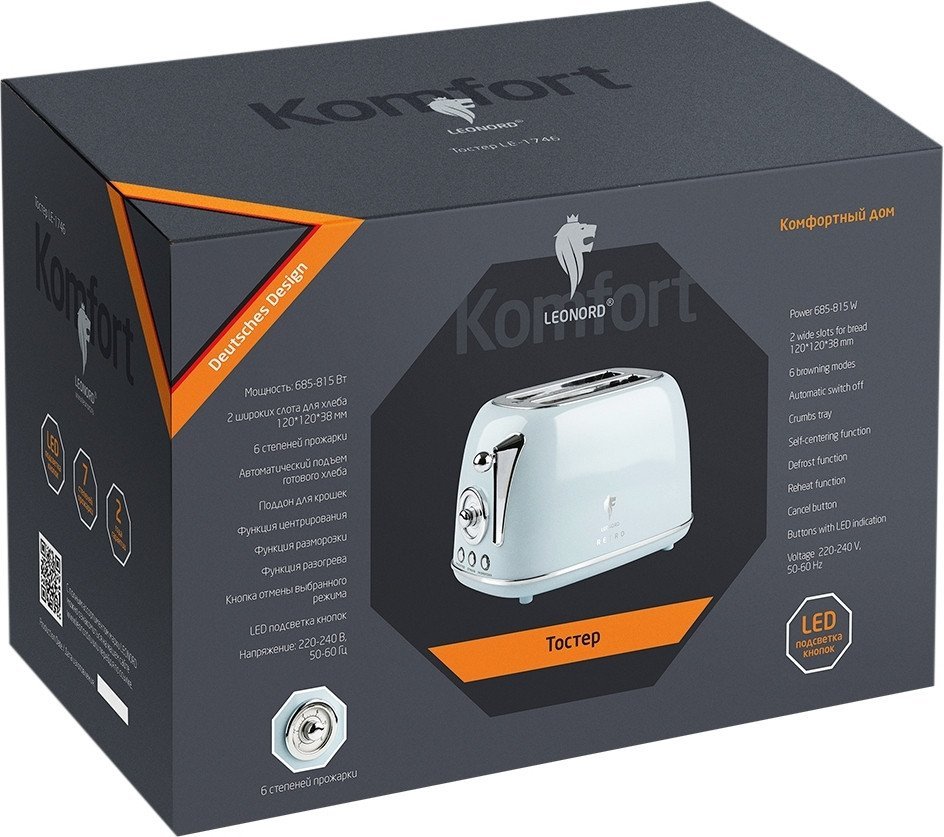 | Информация | - Нежно голубой тостер от Leonord в очаровательном стиле 50-х годов. - Тостер имеет шесть степеней прожарки, включая функции разогрева, разморозки и центрирования. - Тостер оснащен съемным поддоном для крошек и LED подсветкой кнопок. - Функциональная и стильная деталь интерьера для Вашей кухни! - Идеально сочетается с нежно голубым чайником, из коллекции RETRO. - Не упустите возможность добавить этот стильный аксессуар в свою кухню! |