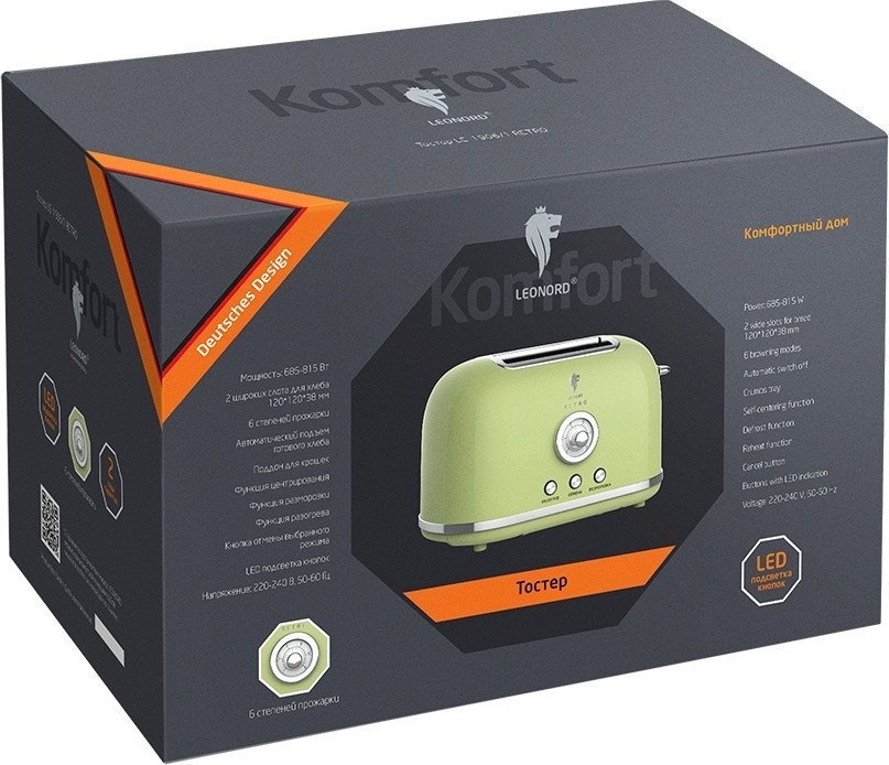 | Информация | - Восхитительный ретро-тостер Leonord LE-1906/1 предлагает 6 уровней прожарки, а также функции разогрева, разморозки и центрирования. - Удобство использования обеспечивается съемным поддоном для крошек и LED подсветкой кнопок, что делает процесс приготовления тостов еще более комфортным. - Элегантный дизайн этого тостера прекрасно гармонирует с чайником из коллекции RETRO, добавляя стиль в вашу кухню. - Не упустите возможность сделать ваши завтраки более вкусными и стильными с этим замечательным устройством! |