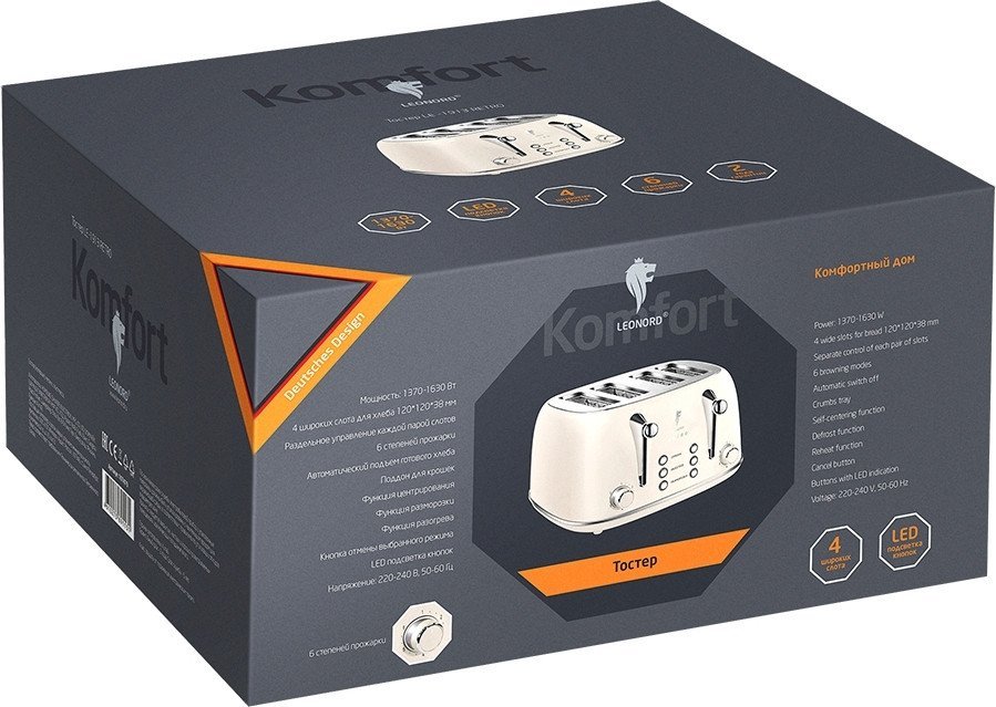 | Информация | - Тостер Leonord на 4 ломтика в стильном винтажном дизайне станет отличным выбором для большой семьи. Он не только готовит вкусные поджаренные тосты, но и создает атмосферу уюта на кухне, добавляя шарм в интерьер. - С 6 уровнями прожарки вы сможете выбрать идеальную степень поджаривания, соответствующую вашим предпочтениям. - Когда тосты будут готовы, они автоматически поднимутся, что позволит вам легко их достать, не опасаясь обжечь пальцы. - Съемный поддон для крошек делает уборку простой, а специальное место для хранения шнура внизу помогает сэкономить пространство на кухне. |