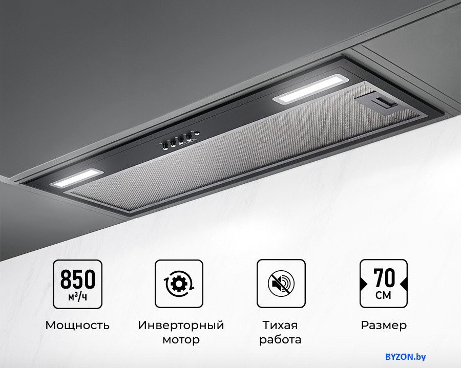 Код товара: 4859268 Рейтинг: 86 4| -33,14 конструкция скрытая, монтаж для встраивания, ширина 69.6 см, управление механическое/кнопочное, производительность мотора 850 м?/ч, цвет черный