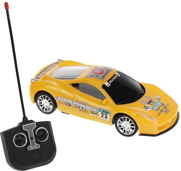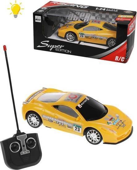 | Информация | Автомобиль на радиоуправлении выполнен в масштабе 1:24. Игрушка двигается вперёд и назад, поворачивает вправо и влево. Команды задаются нажатием рычагов пульта в соответствующие стороны. Во время игры загораются фары. |