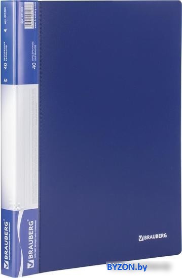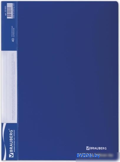 Информация | Папка BRAUBERG «Стандарт» солидного синего цвета отлично подходит для хранения документов, составления каталогов, меню и т.п. На корешке имеется карман для маркировки содержимого. Папка изготовлена из качественного пластика толщиной 0,7 мм с антибликовой фактурой, а ширина корешка составляет 25 мм. Содержит 40 вкладышей, позволяющих хранить документы формата А4 и обеспечивающих их надежную защиту от попадания влаги, пыли и прочих повреждений. Поставляется в индивидуальной упаковке. |