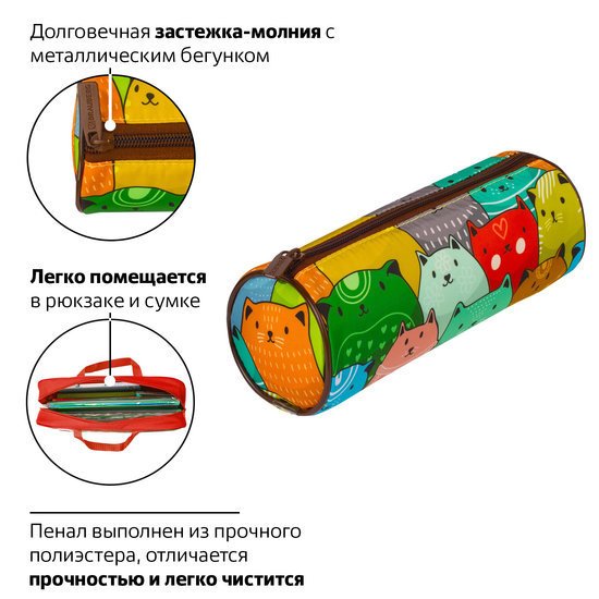 Информация | Пенал-тубус BRAUBERG «Cats» выполнен из прочного мягкого материала с эффектом Soft Touch. Пенал вмещает до 50 канцелярских принадлежностей стандартных размеров. Надежная молния оснащена брендированным бегунком. Выполнен из прочного полиэстера, внутри есть подкладка, которая дополнительно защищает содержимое. Пенал имеет оптимальный размер для размещения в нем не только письменных принадлежностей, но и повседневных мелочей, косметики, аксессуаров, таким образом может выполнять роль универсальной сумочки-косметички, которую можно всегда взять с собой. Яркие универсальные дизайны привлекут внимание широкой аудитории: от учеников начальной школы до студентов. Упакован в ПЭТ пакет с европодвесом, который сохранит качество и товарный вид при хранении и транспортировке. |