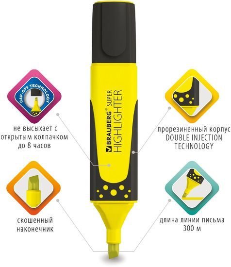 Информация | Текстовыделители BRAUBERG «SUPER» предназначены для выделения текста на бумаге любого типа. В наборе четыре неоновых цвета: желтый, зеленый, голубой и розовый. Плоская форма корпуса, диаметр которого 25 мм. Резиновые вставки обеспечивают эргономичную зону захвата, предотвращая скольжение в процессе использования. Скошенный наконечник имеет толщину линии письма от 1 до 5 мм, что обеспечивает удобство при работе с текстом, напечатанным мелким шрифтом, или таблицами. Благодаря особой водной основе чернил текстовыделители не высыхают без колпачка в течение 8 часов. Текстовыделители обладают экономным расходом чернил, при этом длина линии письма достигает 300 метров. Чернила быстро впитываются, предотвращая размазывание. Цвет корпуса соответствует цвету чернил. |