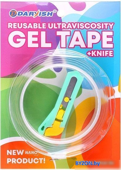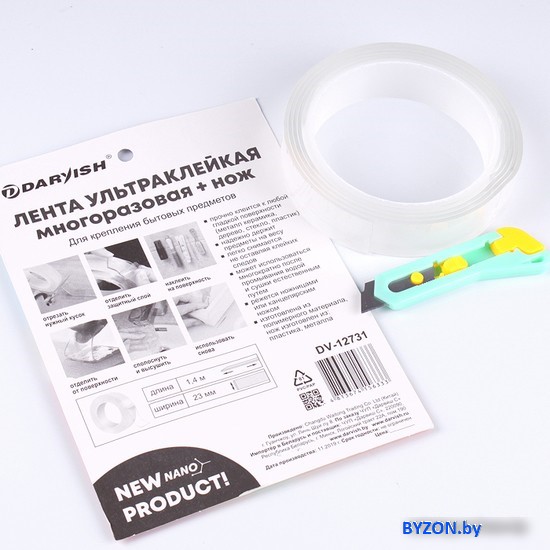 Информация | Лента ультраклейкая двусторонняя многоразовая + нож. Предназначена для крепления бытовых предметов к любой гладкой поверхности (металл,керамика,дерево,стекло,пластик). Легко снимается, не оставляя клейких следов.Может использоваться многократно после промывания водой и сушки естественным путем. Изготовлена из полимерного материала.Длина -1,4м,Ширина-23мм.Нож: пластик, металл. Размер упаковки 13*18см.Европодвес. |