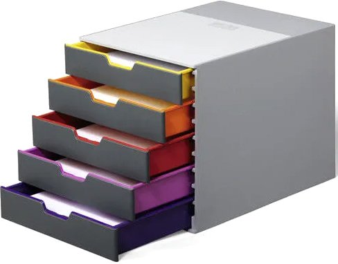Информация | Короб для документов Varicolor с 5 выдвижными цветными ящичками. Оснащен стопорами и табуляторами для маркировки. Можно устанавливать друг на друга (фиксируется при помощи резиновых ножек). Стильный дизайн эффектно впишется в любое рабочее пространство, а цветные ящики отлично подчеркнут вашу индивидуальность. |