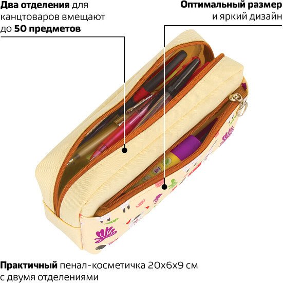 Информация | Пенал-косметичка ЮНЛАНДИЯ предназначен для хранения школьных принадлежностей, вмещает до 50 канцелярских предметов стандартного размера. Удобный и вместительный пенал не займет много места в школьном ранце или рюкзаке. Выполнен из прочного полиэстера. Имеет два вместительных отделения. Застегивается на молнию с металлическим бегунком в виде сердечка. Поставляется в прозрачном полиэтиленовом пакете с картонным подвесом. |