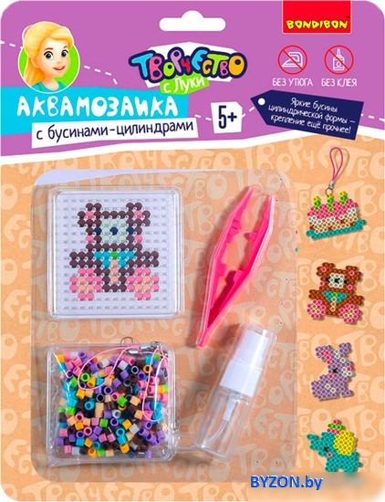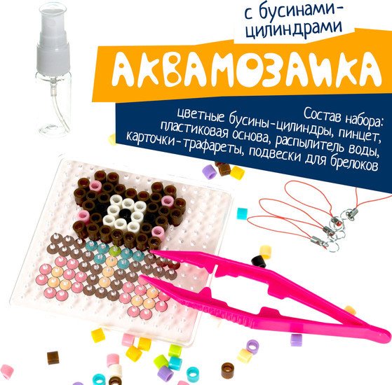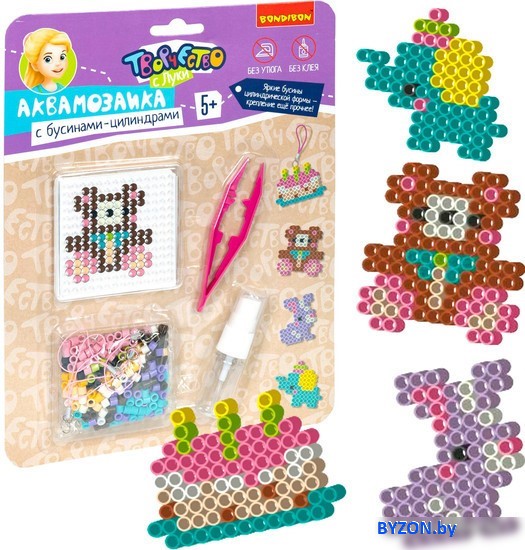 | Информация | Набор для творчества BONDIBON. Аквамозаика с бусинами-цилиндрами "У мишки День Рождения" Создайте яркую подвеску-брелок своими руками вместе с набором для творчества аквамозаика "У мишки День Рождения" от Bondibon. Серия Творчество с Буки развивает художественный вкус, мелкую моторику и воображение ребенка. Поместите цветную схему под трафарет и выложите на него бусины, смочите водой из распылителя, дайте высохнуть. Снимите получившуюся фигурку и положите ее на чистый лист бумаги до полного высыхания. Прикрепите подвеску, чтобы получился брелок. Готово! В результате у Вас получатся уникальные персонажи, которые пришли на праздник: мишка, зайчик, слоник и сказочный торт. В комплекте: цветные шарики, пластиковая основа, распылитель воды, карточки-трафареты, пинцет и подвески для брелоков. Рекомендуемый возраст 5+. Набор для творчества аквамозаика "У мишки День Рождения" от Bondibon – это отличный способ для ребенка провести время с интересом и пользой и создать удивительную поделку своими руками._x000D_ |