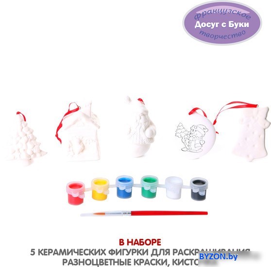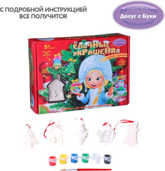 | Информация | Набор для творчества Bondibon"Ёлочные украшения" Процесс создания чего-то своими руками необычайно интересен и познавателен. В наборе 5 керамических фигурок для раскрашивания: домик, Д.Мороз, елка, колокол, круг, разноцветные краски, кисточка. Попробуйте свои силы, и Вы получите чудесное украшение на новогоднюю ёлку или фигурку-подарок. |