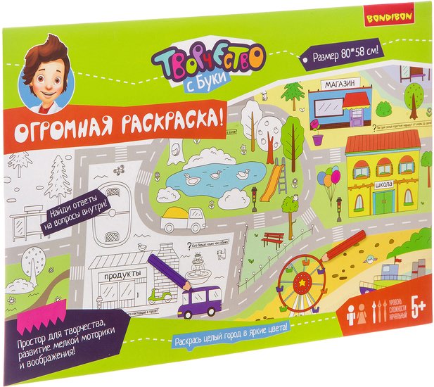 | Информация | Раскрась целый город в яркие цвета! Ты можешь делать это самостоятельно или в компании с друзьями или родителями! Ни в чем себя не ограничивай! Раскрашивай, придумывай истории, рисуй новых персонажей! Размер раскраски 80х58 см |