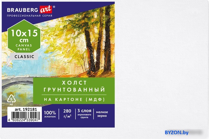 | Информация | Грунтованный холст на МДФ BRAUBERG ART «CLASSIC» используется для работы масляными, темперными и акриловыми красками. Предназначен как для начинающих художников, учеников и студентов художественных школ, так и для профессионалов. Прочная поверхность холста выдерживает множество слоев краски и воздействие разбавителей, хорошо переносит изменения влажности и температуры. Грунтованное мелкозернистое полотно из 100% хлопка плотностью 280 г/м2 наклеено на основу из МДФ. Холст на МДФ легче и меньше по сравнению с холстами на подрамнике, тем самым он очень удобен для транспортировки. В то же время холст на МДФ прочнее холста на картоне. Размер — 10х15 см. |