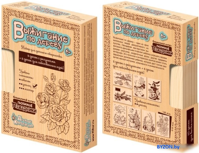 | Информация | Доска для выжигания по дереву — это, как правило, вырезанная в размер фанера, на который наносится рисунок. Закончив выжигание, ребенок получает готовый подарок маме, папе, бабушке или дедушке. Осознание этого придает работе особую значимость. Понимают это и педагоги, поэтому именно эти доски для выжигания по дереву чаще всего покупают в ДОУ и младшие классы школы. Что представляет из себя набор? Это десять кусков качественной сертифицированной фанеры размером 148?213 мм, на восемь из которых нанесены рисунки, посвященные различным событиям, в том числе любимым праздникам. Причем нанесены они специальной немецкой краской, не выделяющей при сгорании (нагревании) вредных веществ. Две дощечки оставлены пустыми. |