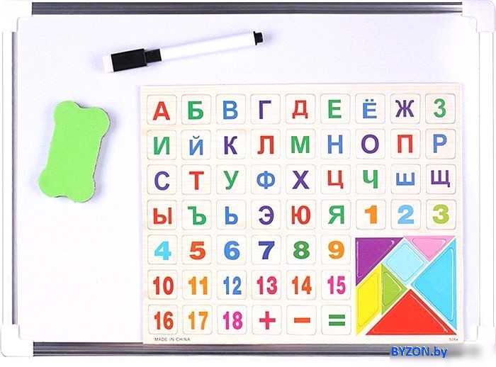| Информация | Алфавит, цифры, знаки помогает развивать ребенка. Занимаясь с ним, вы произносите звуки, показываете буквы, цифры и даёте их в руки ребенку. Когда он слышит звуки, видит фигуры и может их потрогать, задействовано сразу три органа чувств: зрение, слух и осязание. Такой подход поможет быстрее запомнить буквы, ведь чем ярче впечатление, тем лучше они запоминаются. Конструкция: односторонняя. Размещение: настольное. Материал каркаса: металл. Комплектация: маркер, губка, набор магнитов, алфавит, цифры. |