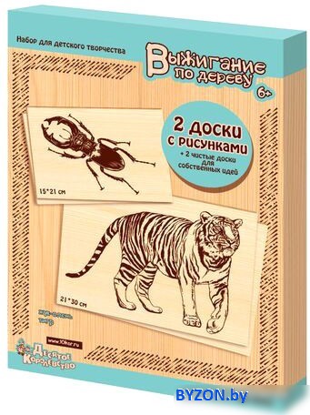 | Информация | Особенностью этого необычного набора досок для выжигания является то, что в него входят фанерки двух размеров – формата А4 и А5 по 2 штуки. На одной фанерке для выжигания, размером 30х21 см (А4) нанесен рисунок «Тигр», а на фанерке для выжигания, размером 21х15 см (А5) рисунок «Жук-олень». Вторые доски чистые – для реализации своих собственных идей. В любом случае рекомендуем обратиться к нашей библиотеке бесплатных рисунков, возможно именно там Вы найдете новые идеи. Доски для выжигания сделаны из высококачественной сертифицированной фанеры толщиной 4 мм, а трафареты рисунков выполнены специальной немецкой краской, не выделяющей в процессе горения (нагрева) вредных веществ. Сложность рисунков рекомендована для тех, кто уже освоил технику выжигания по дереву. «Десятое королевство» предлагает, пожалуй, самый большой ассортимент досок для выжигания по количеству в наборах, тематике и сложности рисунков, поэтому надеемся, что каждый найдет для себя подходящий набор фанерок для выжигания. |