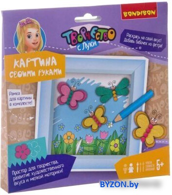 | Информация | Картина своими руками! Раскрась на свой вкус. Добавь бабочек из фетра. В наборе: основа для картины, сборная рамка, материалы для украшения (фетр и металлические пины), двусторонняя клейкая лента. Состав: картон, фетр, металл. Для детей старше 5-ти лет. Не рекомендуется детям до 3-х лет. Содержит мелкие детали. Сделано в Китае. |