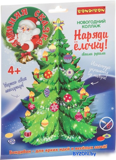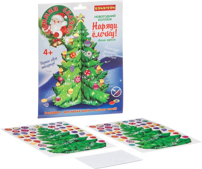 | Информация | Зимняя сказка - это новогодний коллаж своими руками! Укрась свой интерьер! Используй аксессуары из набора для украшения 3D-ёлочки. В наборе есть всё необходимое: заготовки из картона, мишура, липучки. Ножницы не понадобятся! Bondibon - для ярких идей и веселых затей!  |