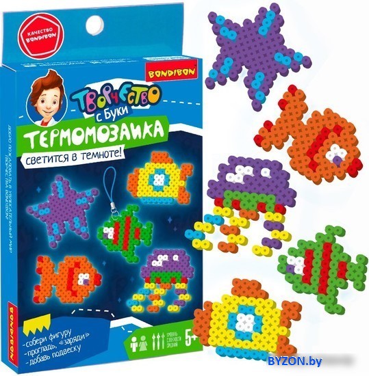 | Информация | Яркие бусины термомозаики «Подводный мир» светятся в темноте. Термомозаика — увлекательный творческий набор для мальчиков и девочек. Из цветных пластиковых бусин создаются различные фигурки довольно необычным способом. Фигурку необходимо собрать на форме-планшете и прогладить через кальку утюгом. Обработка горячим расплавит бусинки и скрепит их между собой. Фигурка остынет и с ней можно играть. Это необычная мозаика — она светится в темноте. Предварительно «зарядите» фигурку на солнце или под искусственным источником освещения и проверьте в темной комнате. С помощью подвесок, входящих в набор, из каждой фигурки можно сделать брелок. |