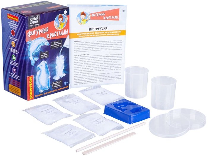 | Состав набора | В наборе 2 мерных стаканчика, деревянная палочка для размешивания, кристаллический порошок, чаша Петри, форма с фигурками животных, инструкция. |