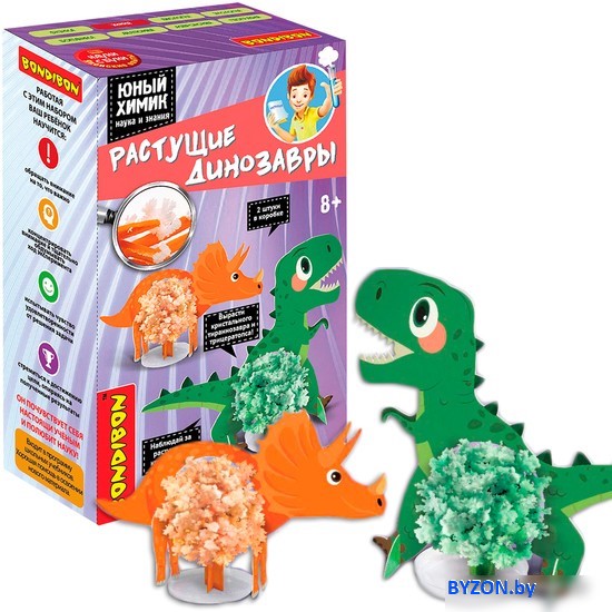 | Информация | Создайте собственных динозавров! С помощью набора "ЮНЫЙ ХИМИК. РАСТУЩИЕ ДИНОЗАВРЫ" из серии Японские опыты «Науки с Буки» от Bondibon вы сможете не только познакомить ребенка с химией, но и поможете развить логику, воображение, мелкую моторику и кругозор. Выберите динозавра, раскрасьте детали и соберите его внутреннюю часть. Вылейте часть раствора на внутреннюю бумажную деталь и соберите остальные части динозавра. Установите его на подставку и ожидайте. Через 12-16 часов кристаллический динозавр будет сформирован. Входит в программу школьных учебников. Хорошая помощь в освоении материалов. |