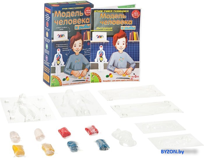 | Состав набора | В состав набора входят корпус для органов человека, корпус для органов рыбы, корпус для тела человека, корпус для тела рыбы, глина четырех цветов, иллюстрированная инструкция. |