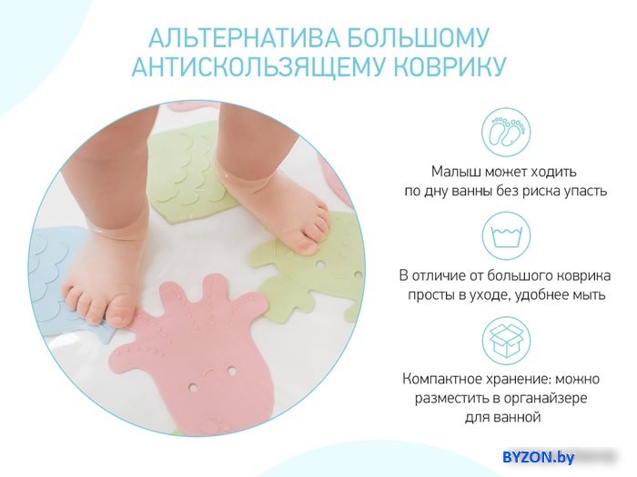 | Информация | Мини-коврики станут отличной заменой большому коврику, который неудобно промывать и сушить. Также их используют как массажеры, потому что рельефная поверхность обеспечивает бережный массаж стоп и ладоней. Ребенок может грызть их, потому что они изготовлены из специального безопасного материала. Ими можно также украсить интерьер, налепив коврики на дно и стенки ванны или кафель, чтобы не только обеспечить удобство, но и расставить легкие цветовые акценты. Кроме того, эти мини-коврики абсолютно не пахнут, потому что не содержат ПВХ. Для ухода их достаточно просто периодически промывать с мылом, полоскать и хорошо сушить. Они легко и надежно крепятся с помощью присосок на любую гладкую поверхность, при этом не оставляют следов. |