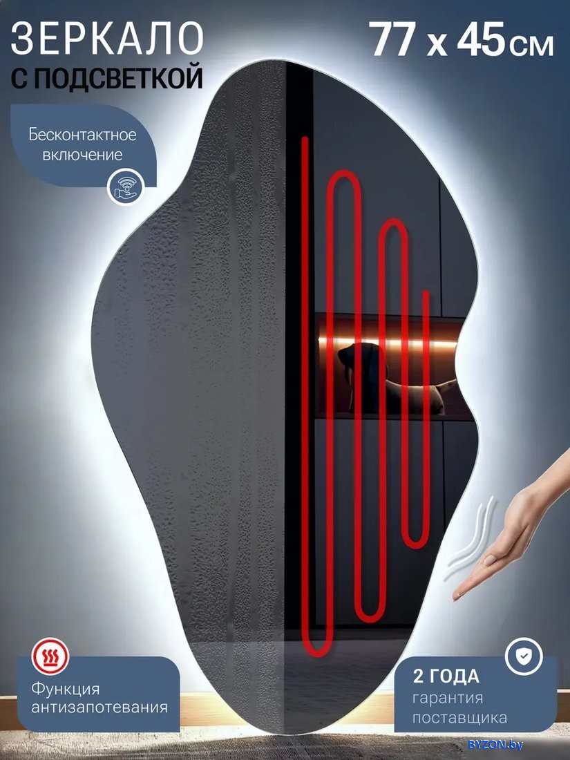 Код товара: 4876107 Рейтинг: 75 2| -64,84 45x77 см, без рамы/стекло, нестандартная форма, установка настенная, зеркальный, подсветка, сенсорное управление