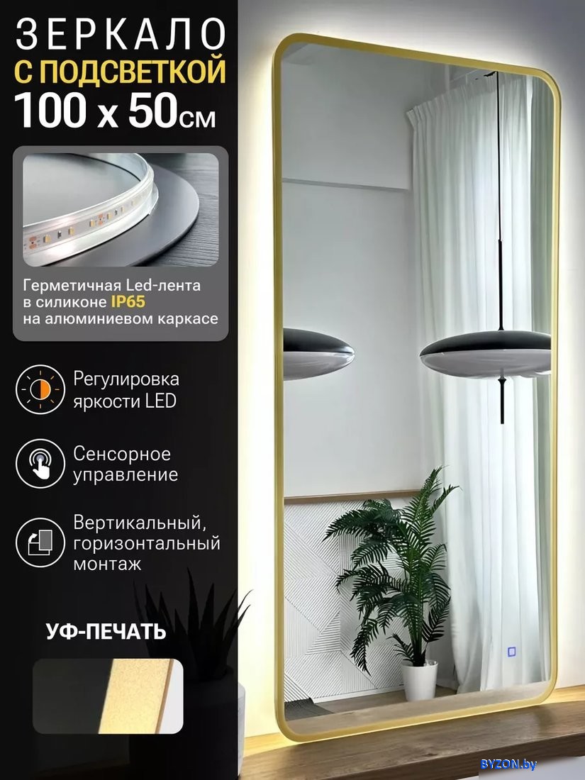Зеркало с подсветкой eMZe Smartphone 50x100 LED.UV.SMART.50.100.AUR (золото с УФ-окантовкой и подсветкой) - купить в Минске