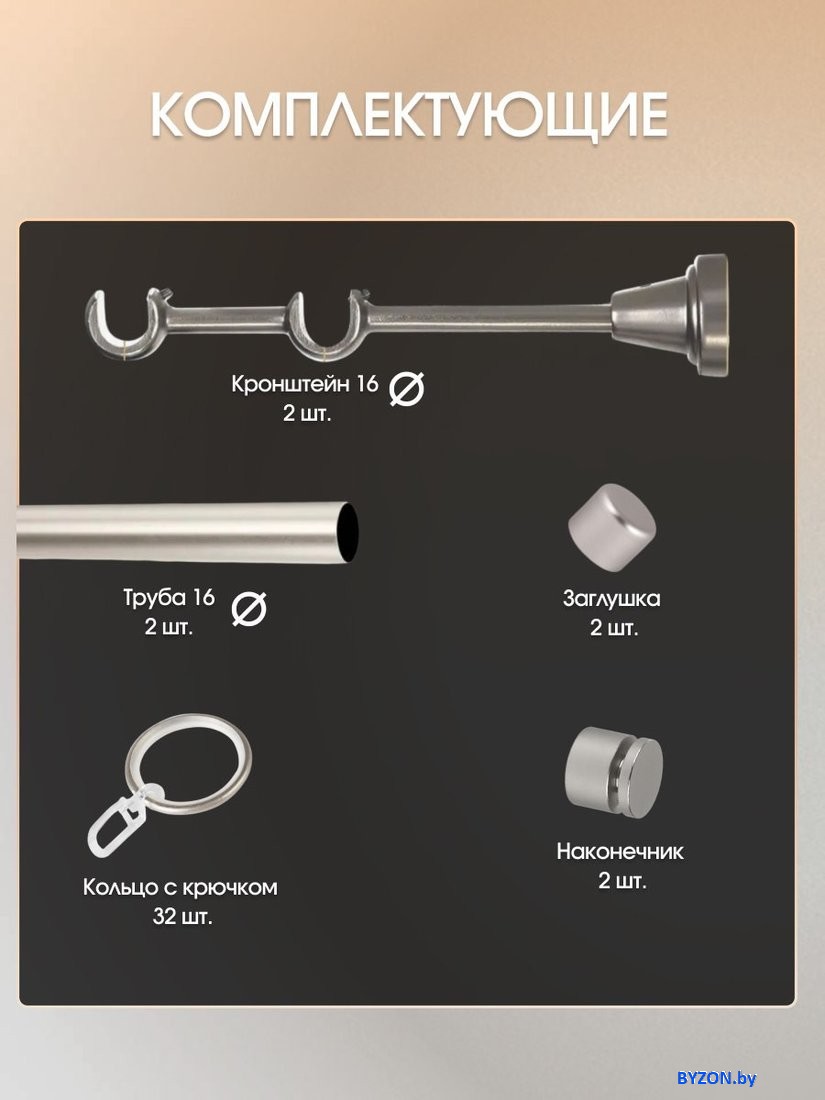 Информация | - Двухрядный настенный карниз для штор — это прочный металлический карниз с изысканным дизайном. - Гальваническое покрытие надежно защищает карниз от коррозии, обеспечивая долговечность. - Универсальный металлический карниз подходит для штор на ленте или люверсах. Благодаря толщине металла 0,6 мм, трубы остаются прочными и не деформируются в процессе эксплуатации. - Премиальная комплектация включает 10 бесшумных металлических колец на каждый погонный метр. Длина карниза указана без учета наконечников. - На внутренней стороне этикетки вы найдете инструкцию по монтажу и информацию о комплектации. |