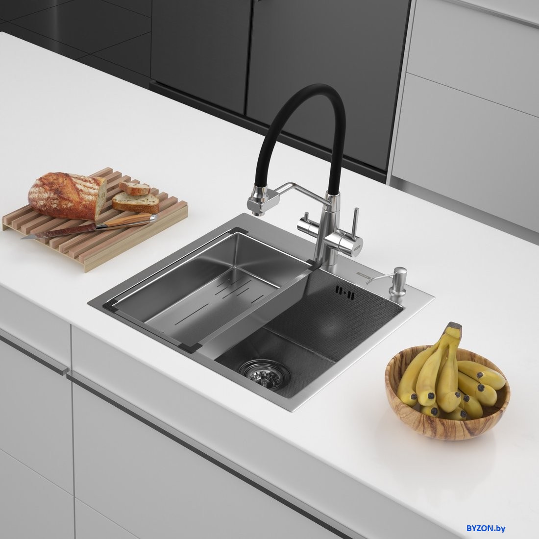 | Комплектация | Кухонная мойка, коландер, дозатор для жидкого мыла, сливная арматура |