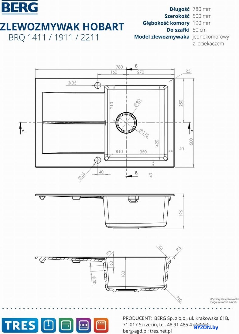 Кухонная мойка Berg Hobart BRQ1911 - купить в Минске