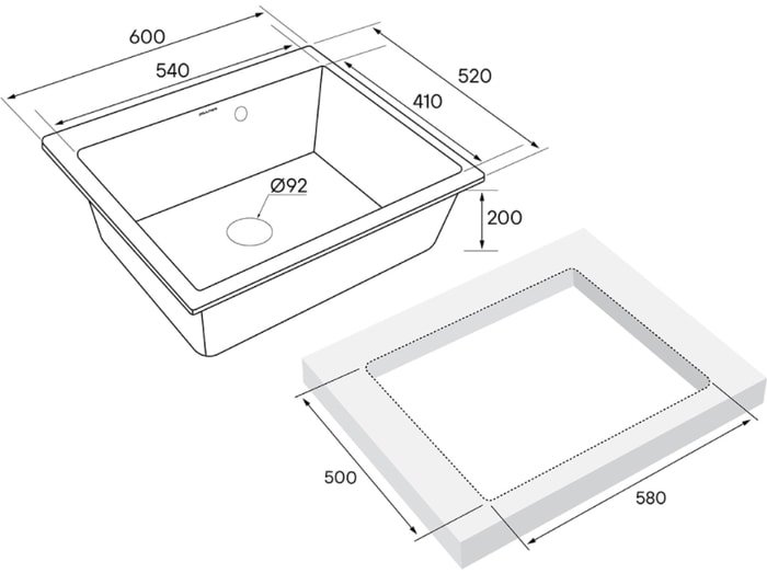 Код товара: 2357804 Рейтинг: 152 1| врезная на столешницу, искусственный камень, размеры: 60x52 см, глубина чаши: 20 см, в шкаф шириной от 60 см