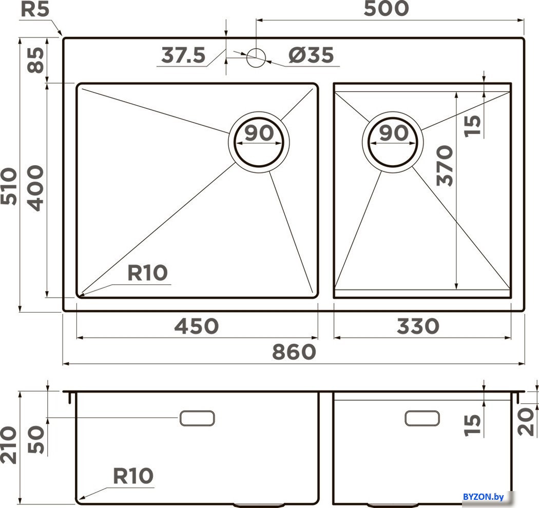 Код товара: 4871013 Рейтинг: 864 7| врезная на столешницу, нержавеющая сталь, размеры: 86x51 см, глубина чаши: 21 см, в шкаф шириной от 90 см