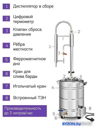 | Основные элементы конструкции | бак, сухопарник, царга (укрепляющая колонна), дефлегматор |