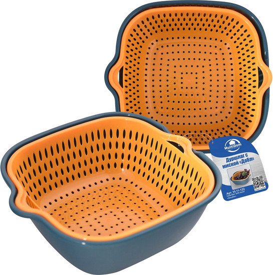 | Информация | Дуршлаг с миской — удобное многофункциональное изделие, необходимое на любой кухне. Дуршлаг может использоваться для промывания фруктов, сухофруктов, овощей и зелени, а также для слива макаронных изделий, вареного картофеля и других продуктов. Миска подойдет для сушки — промойте продукты и поместите дуршлаг в емкость, чтобы лишняя вода не стекала на стол. Приспособление удобно для размораживания мяса и рыбы. Миска также может использоваться самостоятельно — в ней можно приготовить салат, подать фрукты и овощи на стол и т.п. Изготовлено: пластмасса (полипропилен). Размеры: дуршлаг – 22,5х20х8 см; миска – 23х21,5х9см, емкость 2000мл. |