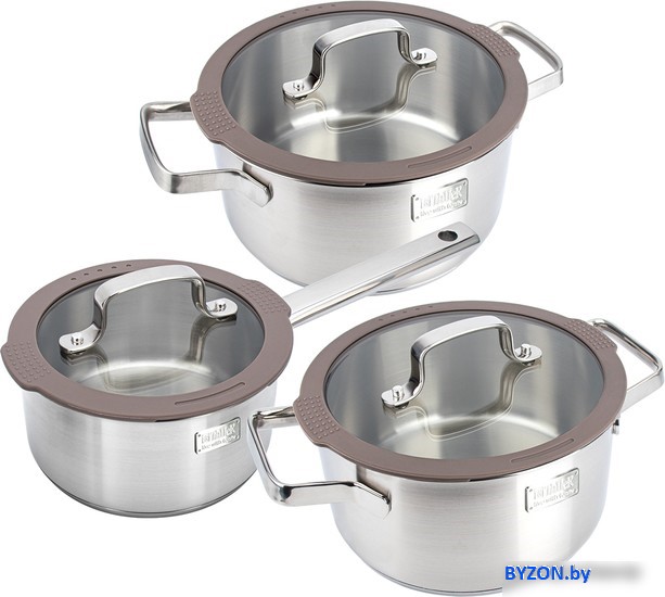 | Состав набора | кастрюля 3.9 л с крышкой; кастрюля 2.1 л с крышкой; ковш 1.5 л с крышкой. |