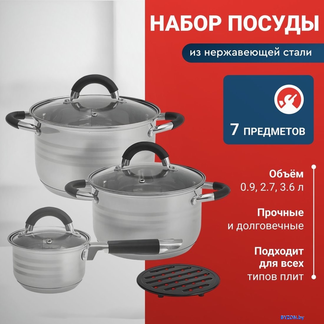 | Состав набора | Состав набора: ковш и 2 кастрюли. 0,9 л, 2,7 л, 3,8 л |