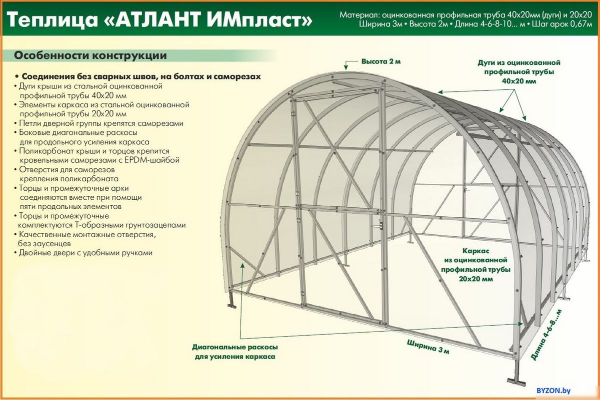 Теплица Импласт Атлант 3х10 дуги 40х20 шаг 67 15330 (с сотовым поликарбонатом 4м) - купить в Минске