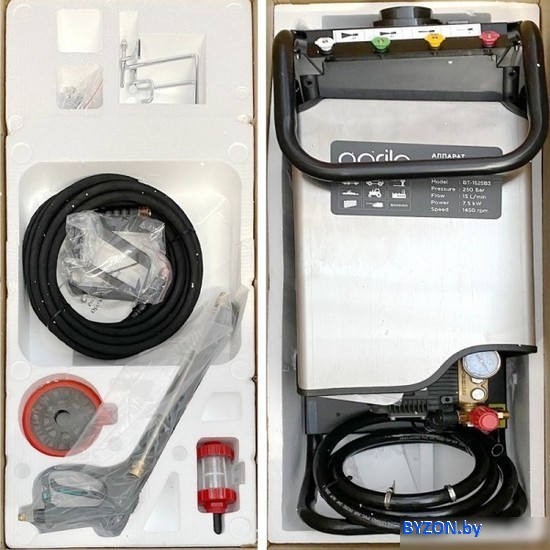 | Комплектация | пистолет с термостойким удлинением шланг высокого давления длиной 10 м шланг забора воды из ёмкости длиной 3 м фильтр тонкой очистки |