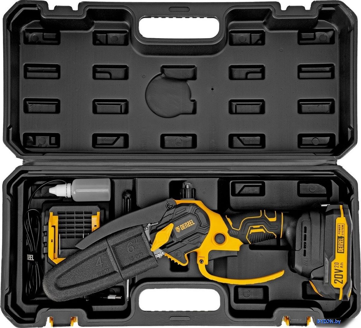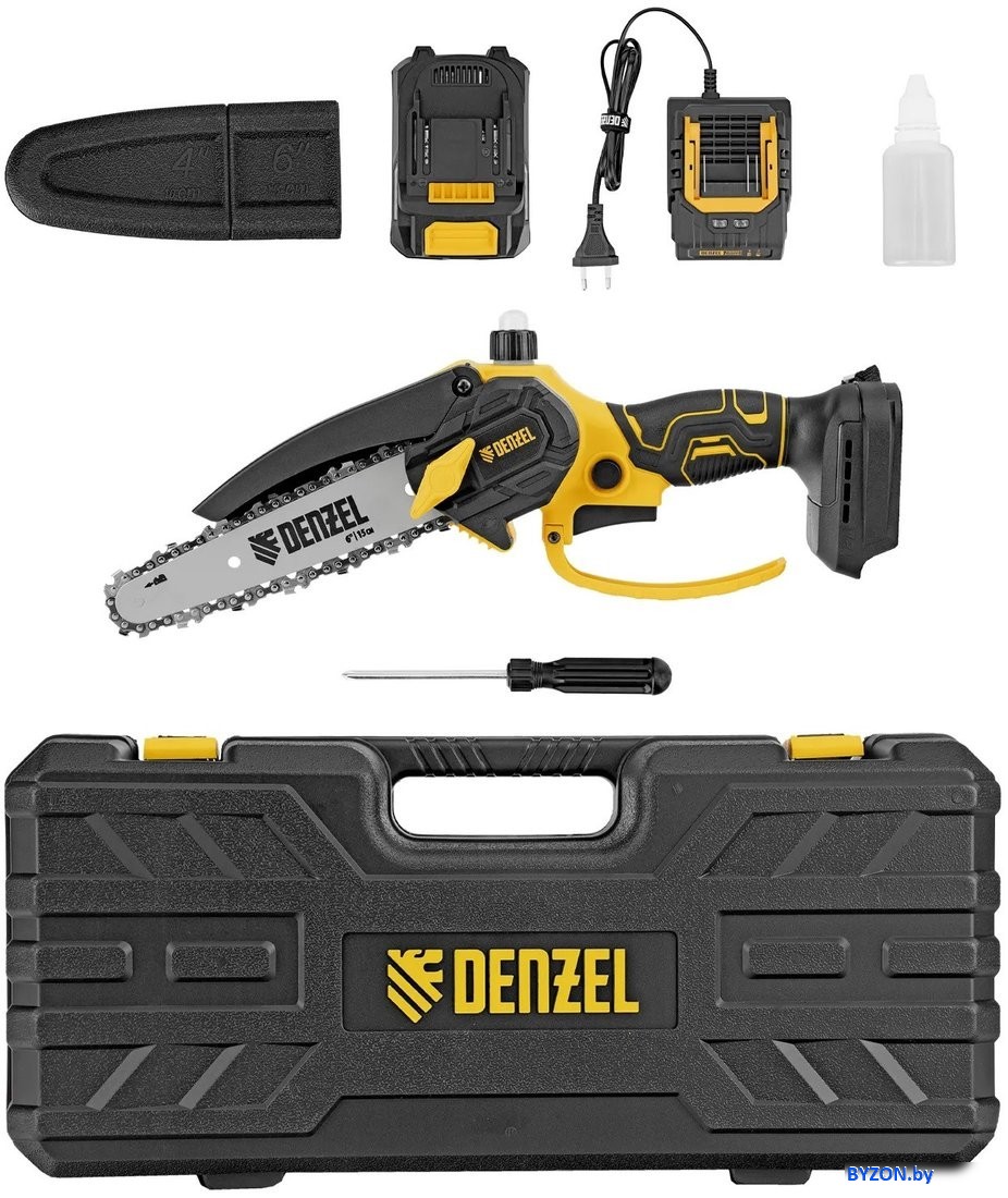 | Комплект поставки | - Мини-пила цепная аккумуляторная; - Масленка; - Аккумуляторная батарея Denzel Power System; - Зарядное устройство; - Кейс; - Инструкция по эксплуатации с гарантийным талоном. |