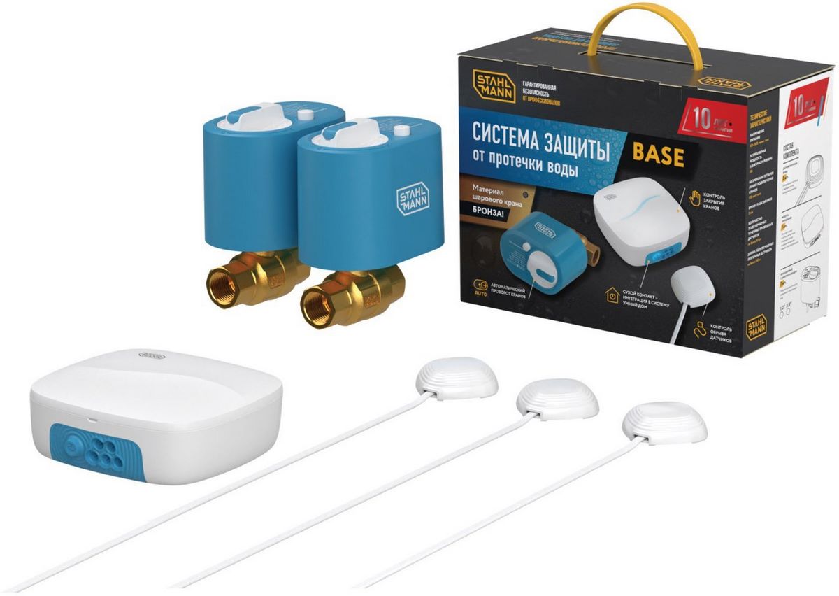 | Комплектация | - модуль управления Stahlmann Base — 1 шт - датчик протечки воды Stahlmann 001 — 3 шт - кран шаровой с электроприводом Stahlmann 3/4F 12В — 2 шт  |