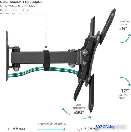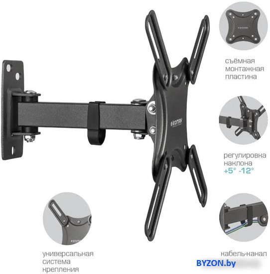 Код товара: 4406370 Рейтинг: 82 5| -56,44 для ЖК-телевизоров, 15-42", настенный, поворотный, кабель-канал, наклон 12°, поворот 90°, цвет черный