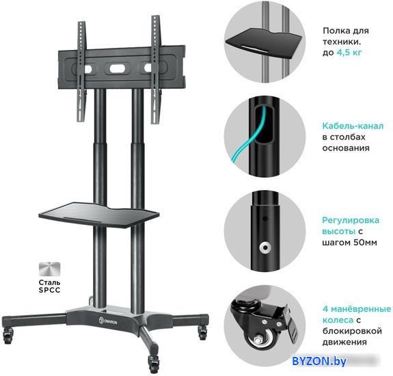 Код товара: 3974835 Рейтинг: 94 6| -113,57 для ЖК-телевизоров, 32-65", настольный, с регулировкой высоты, кабель-канал, с полкой, регулировка высоты 1200-1500 мм, цвет черный