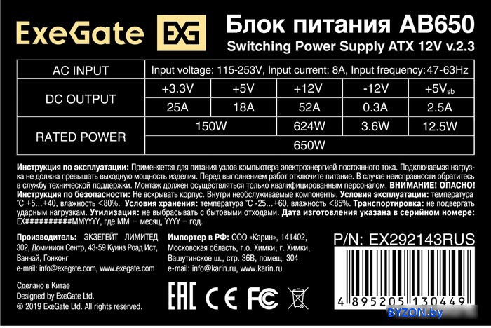 Блок питания ExeGate AB650 EX292143RUS-PC - купить в Минске