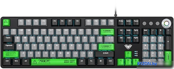 | Информация | ? Многоцветная подсветка кнопок и символов. ? Мультимедийные кнопки, совмещенные с F*. ? Дополнительные кейкапы зеленого цвета. ? Подключение кабелем Type-C-USB-A. ? Свитчи синего цвета. ? Роллер управления. ? Съемная верхняя панель. |