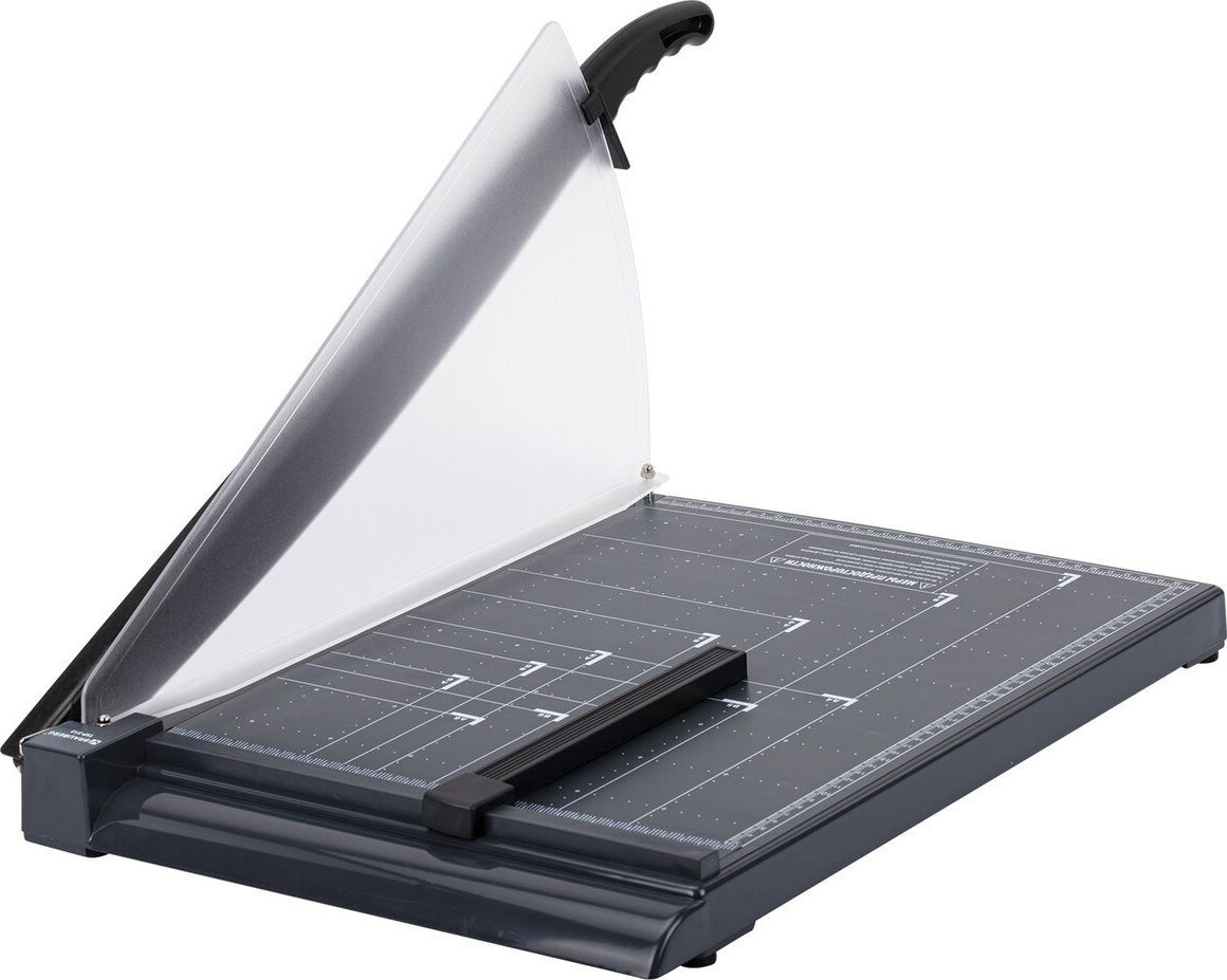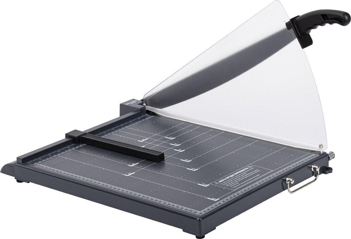 | Информация | Сабельный резак для бумаги подходит для домашнего и офисного применения. Позволяет одновременно разрезать до 12 бумажных листов формата А3. Оснащен безопасным лезвием, регулируемым пластиковым упором и прижимом для бумаг. Рукоятка анатомической формы препятствует соскальзыванию руки, а специальное крепление для рукояти зафиксирует её в закрытом положении и предотвратит непреднамеренное поднятие. Удобная разметка рабочей поверхности позволяет точно наметить линию реза. Длина реза составляет 430 мм. Также имеются уголки для форматов A3, B4, А4, B5, А5, B6. Резиновые ножки вкупе с прочным основанием предотвращают скольжение по рабочему столу во время эксплуатации. С сабельным резаком для бумаги выполнять повседневные задачи станет проще, чем когда-либо! Приобретите его и убедитесь в этом сами. |