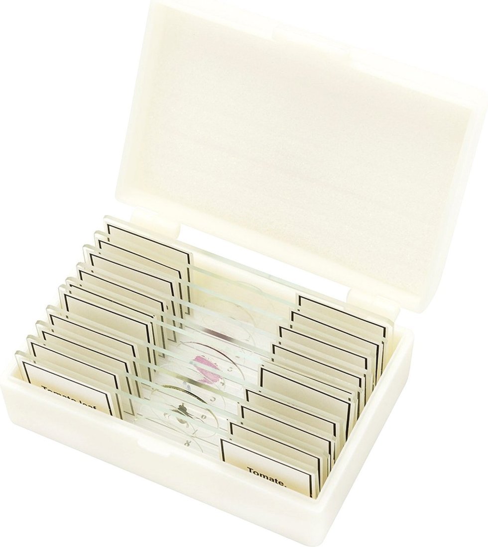 Образцы микропрепаратов | Диатомовые водоросли; Вольвокс; Стебель сахарной кукурузы, поперечный срез; Мазок из ротовой полости; Мазок сперматозоидов; Митоз животной клетки; Корневой чехлик лука; Голова мухи; Пыльник лилии; Лист томата, поперечный срез |
