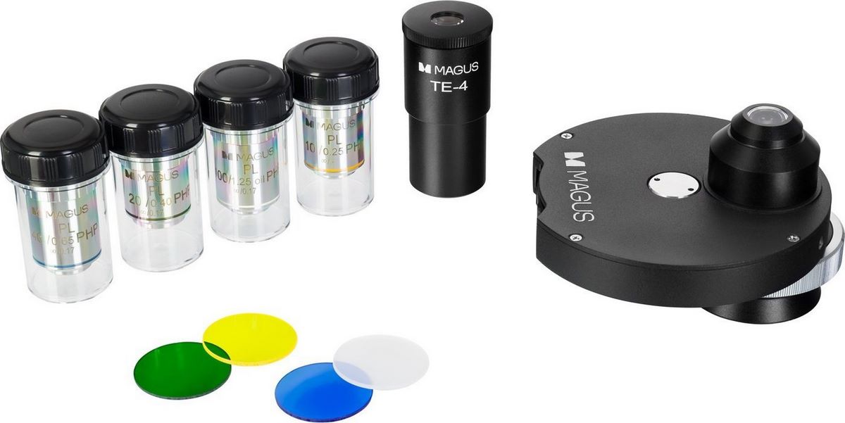 Полная комплектация | Фазовый конденсор, фазовые объективы, вспомогательный микроскоп, светофильтры, флакон с иммерсионным маслом |